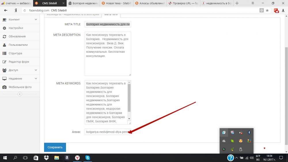 Дмитрий Кондин 691 Жалоба Опубликовано: January 17, 2017 13 часа назад, Helenblondi сказал: не обновляются алиасы ни в статьх ни в объявлениях. подскажите пожалуйста как исправить. в мета тайтл сделала ошибку. (пенсиоривор написала вместо пенсионеров)исправила. обновила алиас. он не обновляется. остается с ошибкой. или например статью назвала по другому. алиас остается от старой. исправляю вручную-ошибка 404 Можно удалить алиас у объявления и нажать сохранить и система сделает объявлению новый алиас. 1 Helenblondi reacted to this Поделиться сообщением Ссылка на сообщение Поделиться на других сайтах