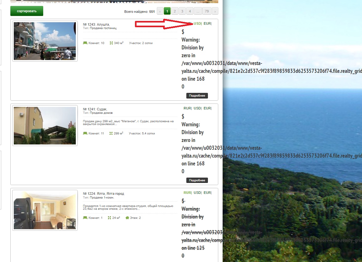 Дмитрий Кондин 691 Жалоба Опубликовано: August 4, 2016 1 минуту назад, Nikvz сказал: Всё обновлено, цены в рублях показывает, в тех объявлениях, где цена была в долларах, теперь нули, при нажатии на USD или EUR ошибка Warning: Division by zero in /var/www/u0032031/data/www/vesta-yalta.ru/cache/compile/821e2c2d537c9f283f89859833d6253573206f74.file.realty_grid_list.tpl.php on line 1680 Скриншот покажите и адрес станицы где делаете скриншот. Поделиться сообщением Ссылка на сообщение Поделиться на других сайтах